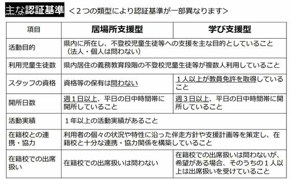 そうした県が抱える課題を受け、多様な学びの場を確保するため、運営の収入源が安定しないフリースクールを支援する認証制度が作られたというわけだ。