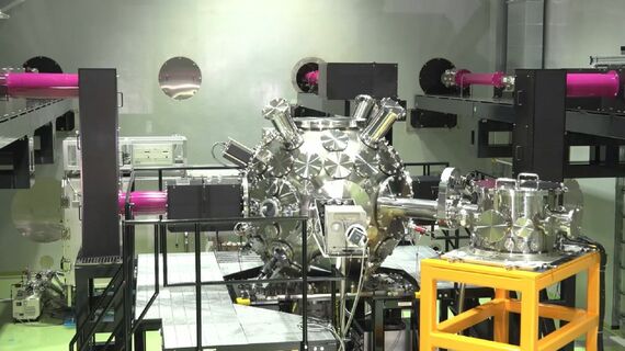 浜松ホトニクス中央研究所内にある実験設備。円形の真空容器の中心に模擬燃料を投入し、レーザーを照射する(写真:浜松ホトニクス)