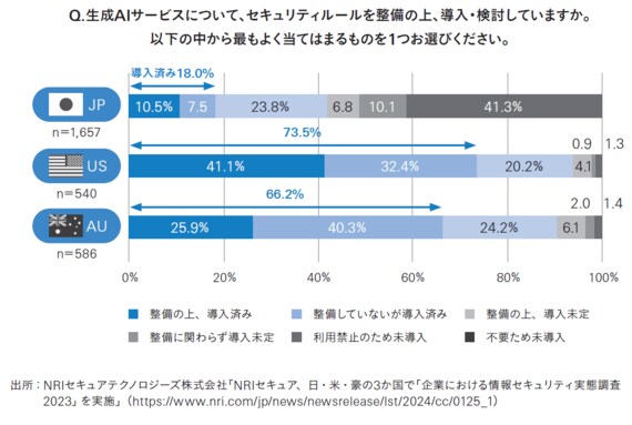 これは、生成AIの活用においても同様です。NRIセキュアテクノロジーズ社が行った、日米豪の3国2783社に及ぶ2023年の調査によると、生成AIを業務に導入している日本企業は18.0%にとどまることが報告されています。これは、アメリカ企業の73.5%、オーストラリア企業の66.2%に大差をつけられています。
