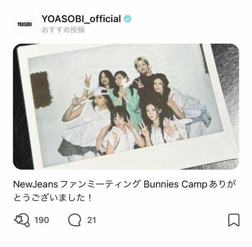 YOASOBIの「Weverse」上での活動はというと、公式コミュニティのファン会員数は現在、1万3000人ほど。まだ様子見の段階と言えますが、韓国のガールズグループの中で今最も人気のあるNewJeans(ニュージーンズ)と一緒に舞台裏の写真を収めた6月28日の公式投稿は反響を得ています。NewJeansが6月26、27日に東京ドームで開催した単独公演「NewJeans ファンミーティング・バニーズキャンプ 2024 東京ドーム」にYOASOBIがゲスト出演したことの報告を兼ねたもので、ファンからの応援コメントも続きました。