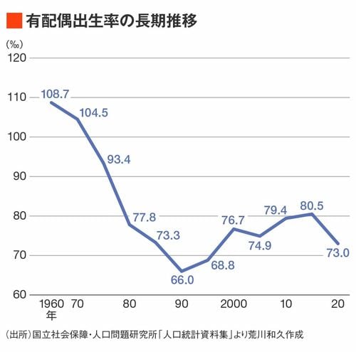 2015年の80.5という数字は、1970年代後半とあまり変わらないくらい、1人の有配偶女性の産む子どもの数は増えていたわけです。2020年に若干さがりましたが、それでも結婚した女性が産む子どもの数は1980年代と比べても見劣りしませんし、ここをこれ以上あげていくというのも限界があるでしょう。