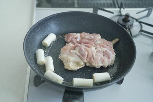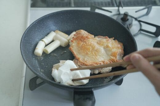 鶏から出た脂で長ネギを焼きつつ、フライパンの温度を下げます。