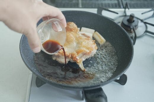 調味料を加えていきます。鶏肉を焼くときは皮と身という性質の異なる2つの素材を焼く気持ちで調理するとうまくいきます。