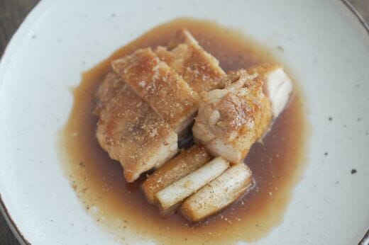 肉の表面には香ばしい焼き色がつき、内側は加熱しすぎずジューシーな状態が理想。そのためには高温と低温という2つの温度を使い分ける必要があります。この調理法では皮目を油脂で焼き、身側は水分を介在させることで約100℃で加熱することで、温度をコントロールしています。