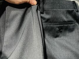 また印象面においては、濡れても「センタープレスが消えない」スラックスが役立ちます。パンツ裏に樹脂コーティングすることで折り目を形状記憶化しているスラックスは、撥水効果があるものとは限りませんが、「濡れることで消えやすい」パンツのラインをパリッと維持できるのです。一般的なサマーウールの場合、「アイロンでつけた折り目が、濡れて弱まる」こともありますが、その心配もありません。