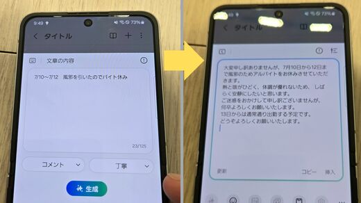 Galaxyのチャットアシストは、生成AIの力を使ってスマホからの文章作成の手間を削減できる機能だ。ごく簡単な下書きを入力するだけで、典型的な文章を作成してくれる。