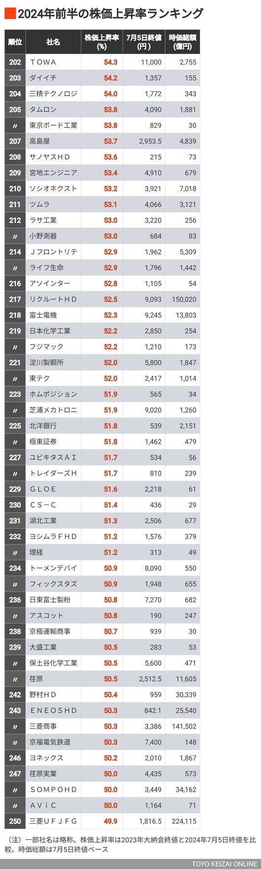 政治・経済・投資 首位583%「2024年前半の株価上昇率」トップ300 55社の株価上昇率が100%以上になった 2分で読める 公開日時:2024/07/10 05:00 東洋経済オンライン編集部 フォロー 1/7 PAGES 2/7 PAGES 3/7 PAGES 4/7 PAGES 5/7 PAGES 6/7 PAGES 次は202~250位 次ページが続きます 7/7 PAGES