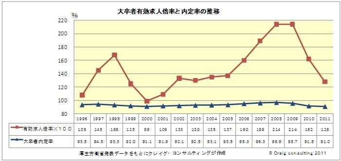 下は年度ごとの大卒者就職内定率(青い折線)と有効求人倍率(赤い折線)の推移を示したグラフである(※有効求人倍率は比較しやすいように100倍した数値でグラフを作成)。
