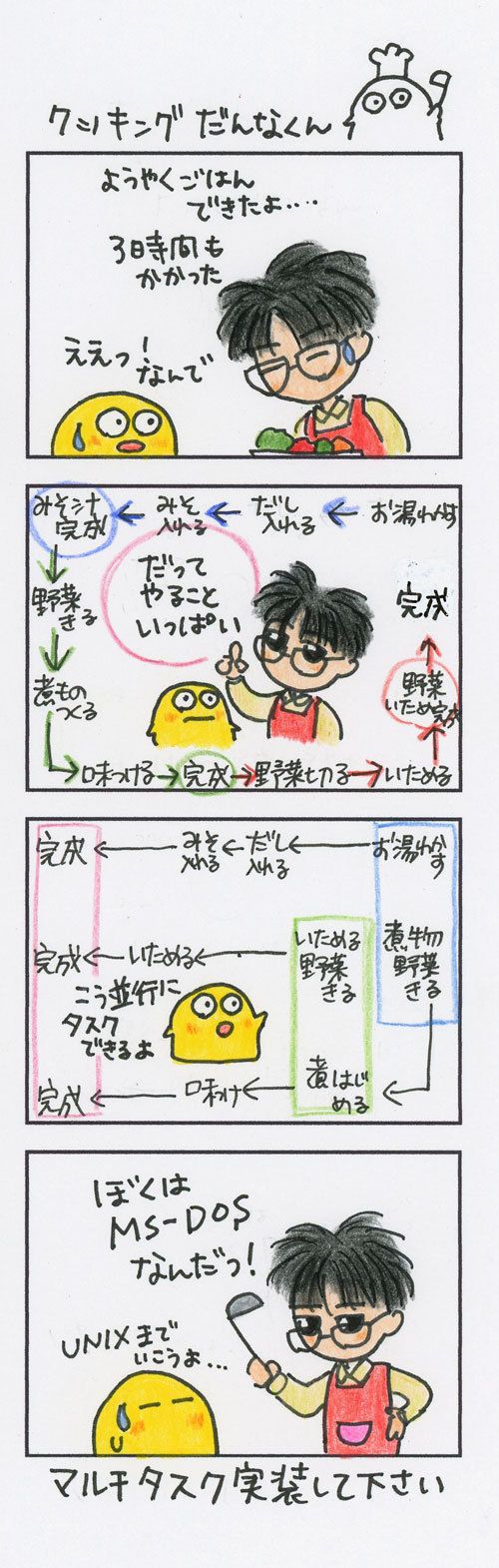 重要なのはマルチタスクです。並行にすすめれば、合間、合間の時間にいろいろなことができるので。これはコンピュータのCPUと一緒です。うまくリソースを配分して使うのです。シングルタスクじゃ、いつまでたっても料理は終わりませんよ。