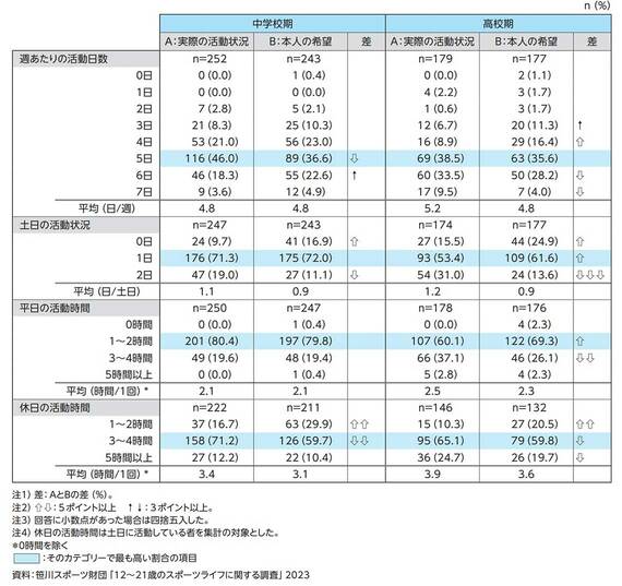 土日の活動状況も、中学校と同様に「1日」の割合が実状と希望ともに最も高い。また、「2日」の割合は実状より希望が17.4ポイント低く、「0日」「1日」は実状よりも希望が5ポイント以上高い。高校生の土日の活動日数は、実状と希望に大きな乖離があるようだ。