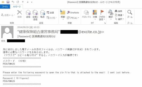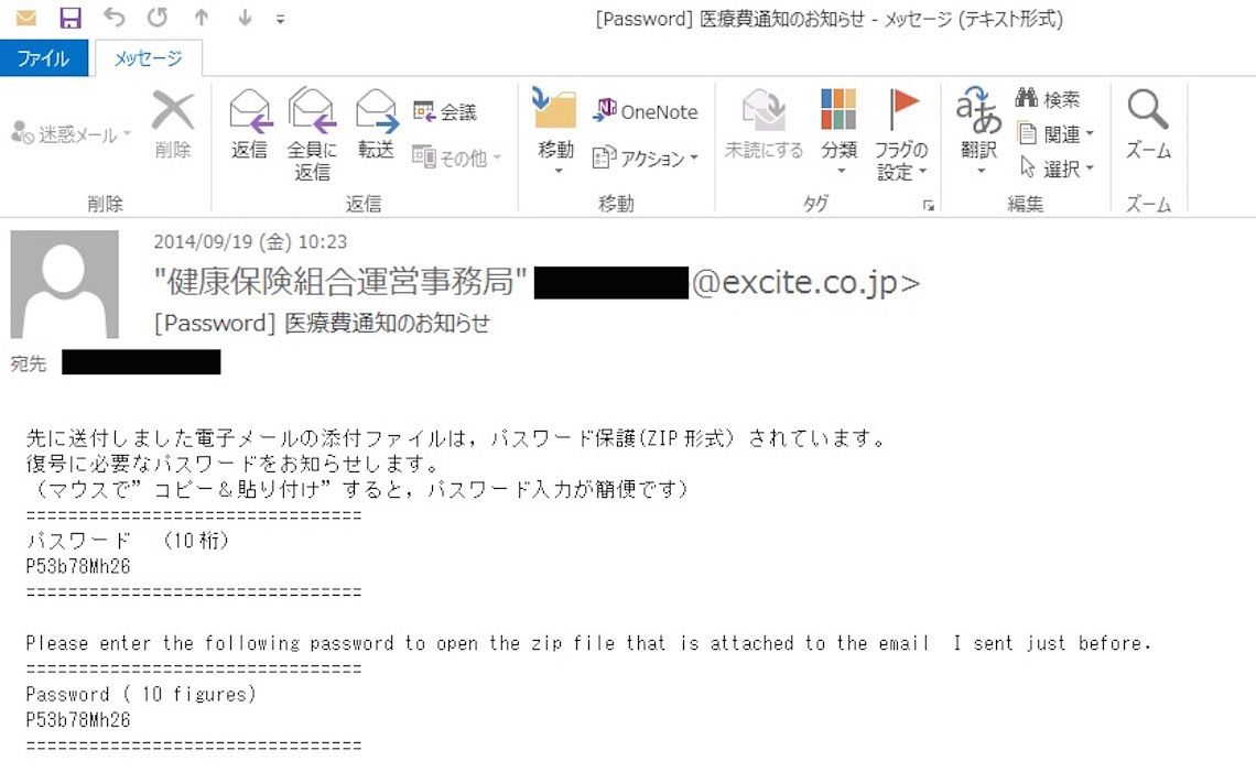 それも例えば、「健康保険組合」といった公的機関など怪しさを感じさせないような送信元を装い、送って来るうえ、添付ファイルを開くには別メールで案内されるパスワードが必要であるとするなど、手が込んでいる。しかも該当ファイルを開けても感染したことに気づかない。
