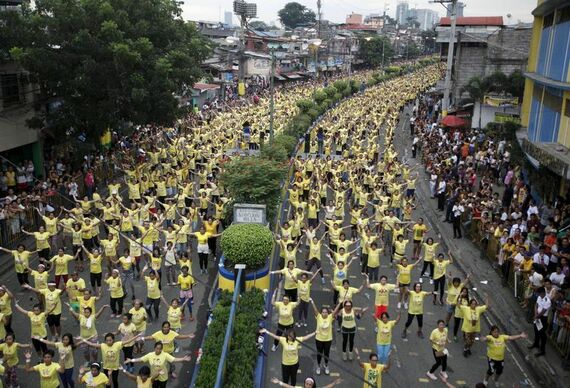 イベントにはおそろいの黄色のTシャツを着た1万2975人が参加。同時にズンバを踊り、ギネス世界記録認定員によると、同国セブ市が2014年10月に達成した8232人での記録を塗り替えた。