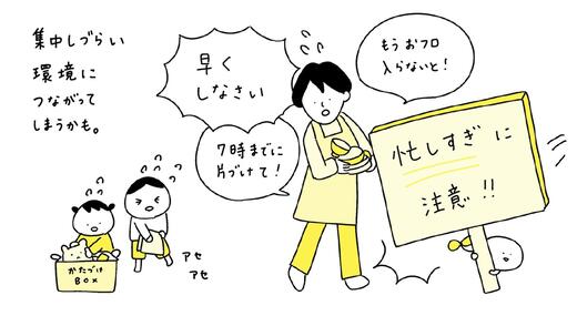 この場合はお子さんだけの問題ではなく、親が「あれもこれもしなくちゃ」と思っているご家庭によく見られます。つまり、家での生活が忙しすぎるのです。