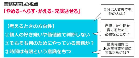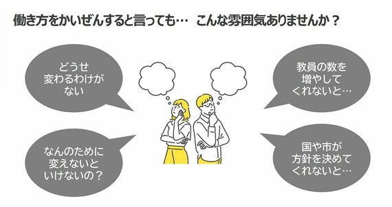 また、先生たちが、それぞれの経験から教育観、指導観、こだわりを持っていることは多い。それはそれで大切なときもあるが、働き方や業務の見直しでは、従来の価値観だけでものを見ると、アイデアが広がらなかったり、対話が深まらなかったりするときもある。