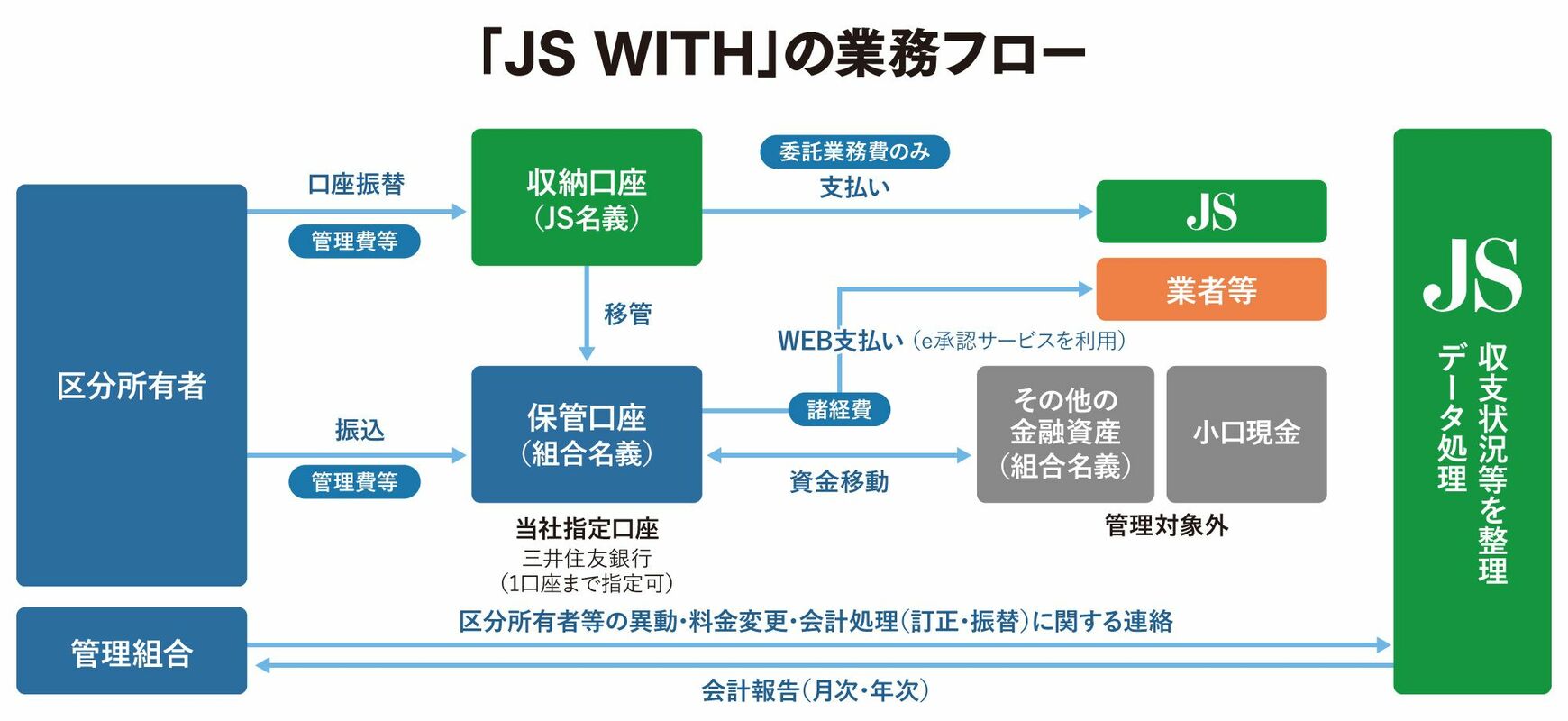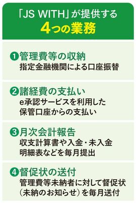 「『JS WITH』は負担の大きい出納・会計業務の中でとくに重要な業務に特化したサービスです。具体的には『管理費等の収納』『諸経費の支払い』『月次会計報告』『督促状の送付』の4つの業務をパッケージ化し、100戸まで月額4万1800円(税込み)という委託しやすい価格設定で提供しています」