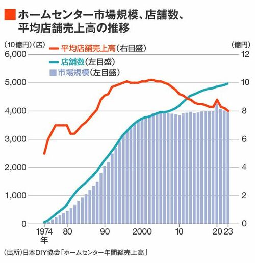 ホームセンターの市場規模(日本DIY協会調べ)は、1990年代くらいまでは拡大を続けていたが、2000年代に入ると4兆円あたりで横ばいとなり、以降はほぼ同水準という状況が続いてきた。