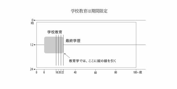 元京都芸術大学副学長の本間正人氏が、まず提示したのが下記の図。人生の中で学校教育の占める割合を表したものです。横軸は年齢。縦軸が時刻を表します。長方形に囲んだ部分は、人の人生の時間を表します。