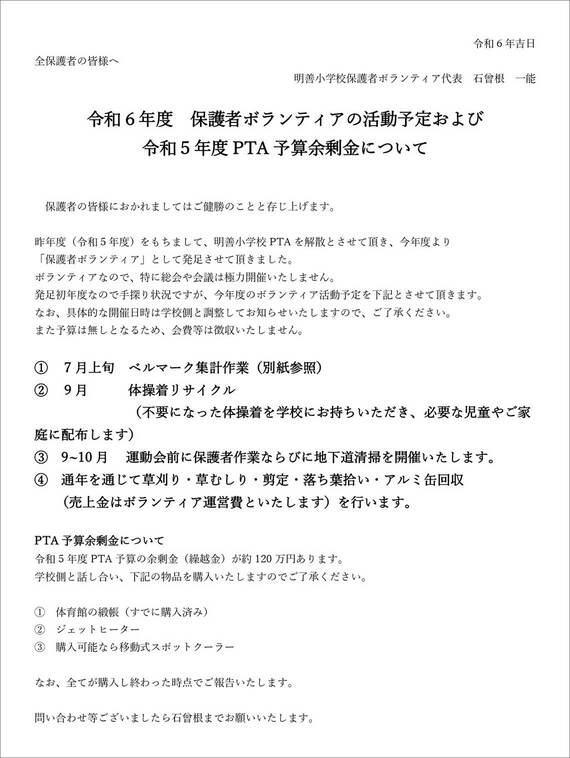 2024年4月。新年度を迎え、石曾根氏は「明善小PTA会長」から「明善小学校保護者ボランティア代表」と肩書きが変わった。新学期に下記の通知を全保護者に配布し、PTA解散を周知した。