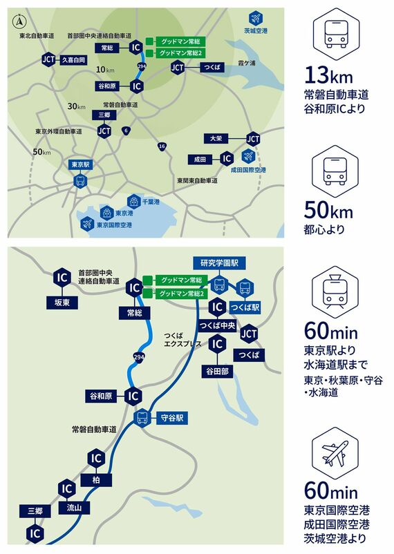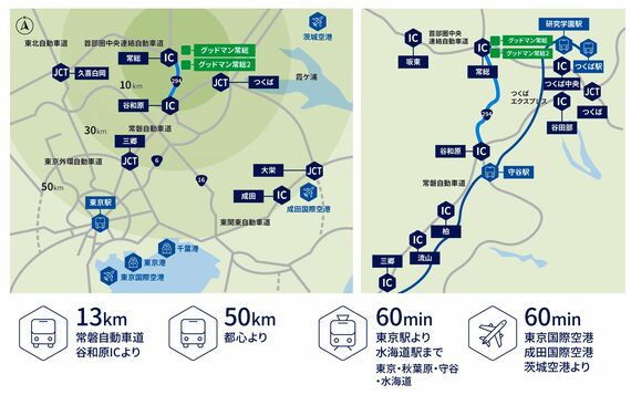 東京都内から車で移動した場合、所要時間は1時間足らず。圏央道の常総IC至近で、常磐自動車道の谷和原ICにも近い場所にあり、全線4車線(片側2車線)のためか流れもいい。成田・羽田国際空港からも約1時間のアクセスで、物流拠点としてのポテンシャルはかなり高い。