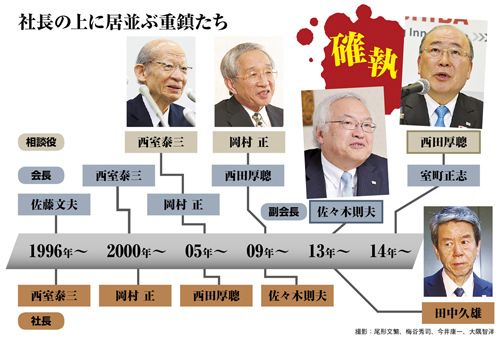 西田は「周囲から引き続きやってほしいと言われた」として会長にとどまり、佐々木は上場以来で初となる副会長職に就き、異例の3トップ体制が構築された。結果、相談役を含めて4人の歴代社長が、現役社長の“上”に並ぶ重層構造ができた。