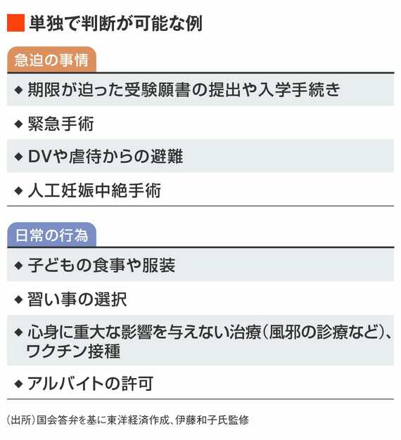 改正法は、共同親権となった場合でも、子の利益のために「急迫の事情」がある場合や「監護及び教育に関する日常の行為」については単独での親権行使が可能だと規定する(改正法824条2)。しかし、例外規定が定める「急迫」「日常の行為」は不明瞭な概念だ。