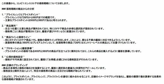 現状の売り場を人間が細かく観察してメモを取らなくても、写真を撮影しておけば戦略を練る上で必要なデータが整理された状態で得られます。扱うデータを視覚化する能力も高く、グラフや図表などの資料を作成してもらうことも可能です。