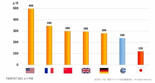 生活習慣病予防効果の高いフルーツですが、2021年の国連食糧機関の統計によれば、各国の国民1人当たりへの1日の供給量(摂取量+廃棄量)について、日本は世界平均の半分しかなく、先進国で断トツ最下位、世界186の国と地域の中で156位でした。日本より少ない国は、アフリカやアジアの発展途上国だけです。