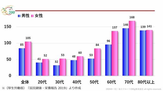 実際、2019年の厚生労働省の統計によると、日本人は平均で、ジャムや果汁などの加工品を含めても、1日に100gもフルーツを食べていません。高齢世代を含め、全世代が国の目標量の200gを大きく下回っています。