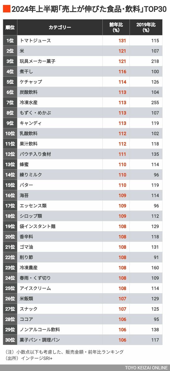 ビジネス 2024年上半期「売れた・売れなくなった商品」TOP30 スーパーやコンビニなど6000店舗のデータを分析 6分で読める 公開日時:2024/07/27 04:00 木地 利光 市場アナリスト フォロー 1/8 PAGES 2/8 PAGES 3/8 PAGES 4/8 PAGES 5/8 PAGES 6/8 PAGES 7/8 PAGES 売り上げが伸びた食品・飲料 次ページが続きます 8/8 PAGES