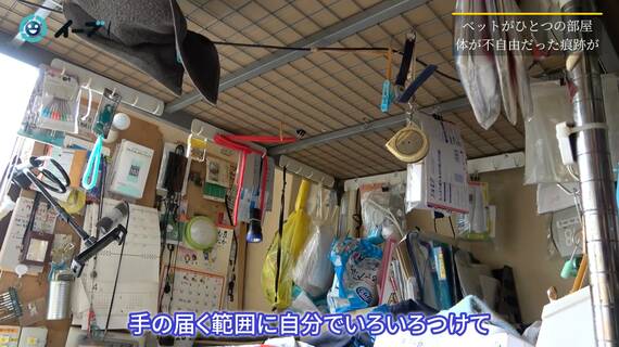 唯一の生活スペースだった二段ベッドの下段にも細々としたモノが散乱している。しかし、ベッドの周りを見てみるとマメな一面も垣間見える。いろんな場所に生活に必要なモノがぶら下がっていて、座ったままでもすぐに手で取れるようになっているのだ。病気で思うように動けなかった様子が浮かんでくる。