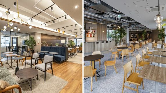 使いやすい家具や什器のそろったセットアップオフィス(左写真:サンフロンティア不動産)や、多様な共用設備が特徴のシェアオフィス(右:東急不動産)が増えている
