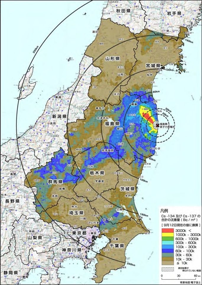福島県から栃木県、群馬県への帯に加え、茨城県南部から千葉県北部に高い放射線量が計測されている。