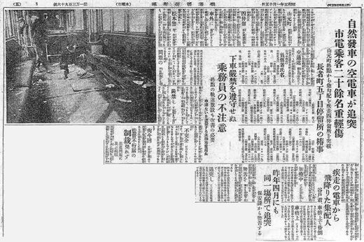 一方、追突された506号車には、乗客乗員20人あまりが乗っていたが、「不意の大激動に俄(にわか)に将棋倒しとなり悲鳴を挙げ我を忘れて車外に逃げ出さんとして転倒し或ひは破れ硝子(ガラス)の為め重軽傷を負い」という大惨事となった。