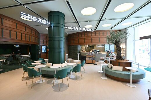 Olive LOUNGE 渋谷店は、JR渋谷駅前の公園通り沿いの旧三井住友銀行渋谷支店を改装。1階に銀行の窓口とATMを設置し、敷居などを設けないオープンなスペースの中に、スターバックスが併設されている。