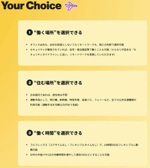 そこには明確に「働く場所」「住む場所」「働く時間」をそれぞれ選択できるとしている。1人ひとりが仕事への責任と目標をもっていれば、どう働いてくれてもかまわない、ただ責任とセットだ、とある。なかなか清々しい。