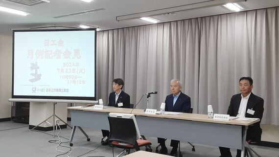7月23日に開催された日本工作機械工業会(日工会)月例記者会見の模様。写真中央が稲葉善治会長、左が柚原一夫専務理事 (記者撮影)