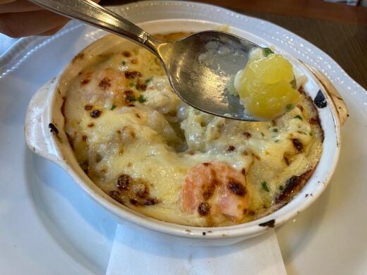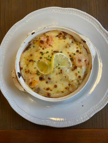 最後にコスモドリアも。一説によるとコスモとはコスモポリタン、つまり宇宙の意味で、空を意味する鶏肉、陸を意味する栗とマッシュルーム、海を意味するエビが入っていることがその名の由来とか。ドリアに栗というイメージは寡聞にしてあまりありませんが、レモンを絞ると一気に栗の存在感が際立ち、これまた飽きずに食べ進められます。