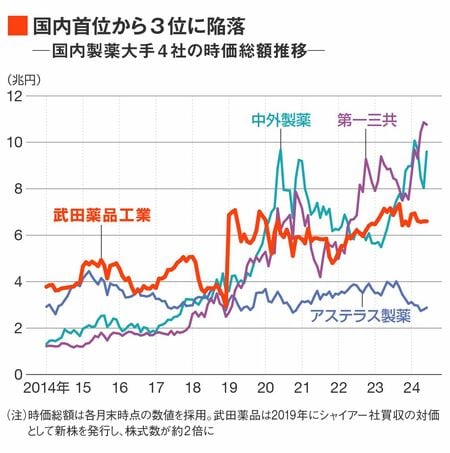 2015年には6000円前後を推移していた株価は、足元では4000円台前半を推移する。売上高(2024年3月期は4兆2637億円)では国内製薬業界の中で首位を維持する一方、時価総額ではこの10年の間に首位から3位へと陥落。第一三共(2024年3月期売上高は1兆6016億円)、中外製薬(2023年12月期売上高は1兆1113億円)の後塵を拝している。