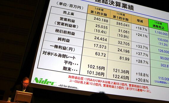 2015年度は順調な滑り出しだった。同日発表した第1四半期の売上高は前年同期比18.7%増の2850億円、営業利益は同24.1%増の310億円。精密小型モーターと車載向けモーターが総じて好調だったことに加え、今年2月に買収が完了したドイツのポンプメーカー、GPM社を連結したことが収益を押し上げた。