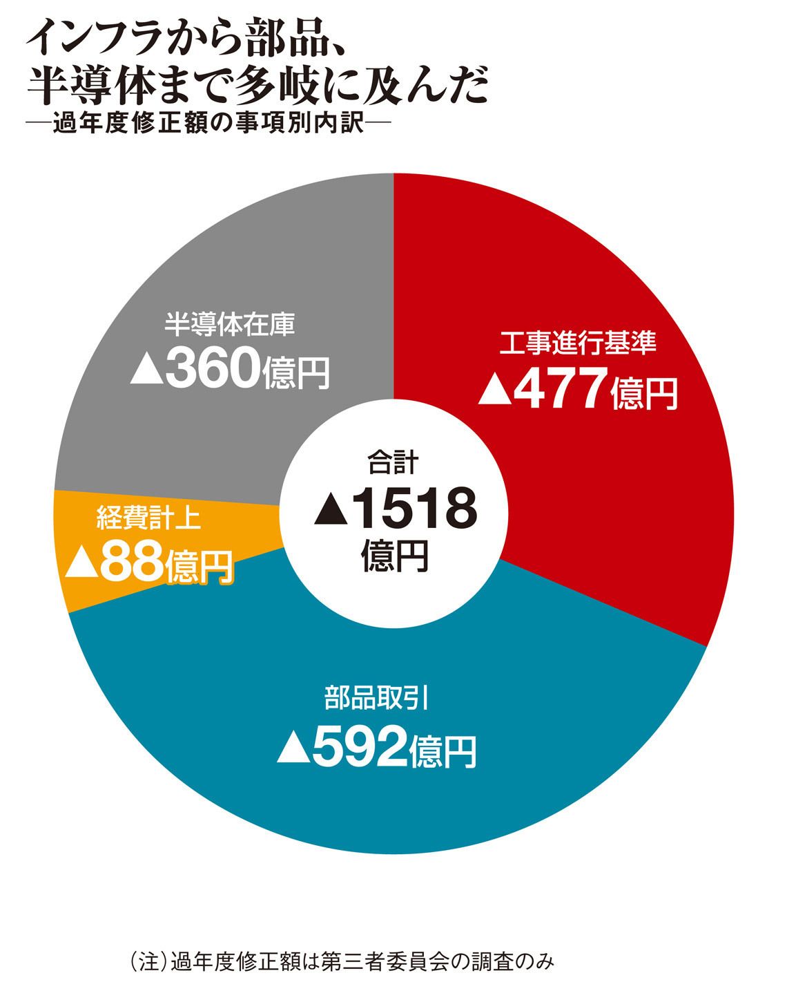 三つ目は「半導体事業の在庫評価」(360億円)である。損失を認識していたにもかかわらず、在庫の廃棄まで評価損を計上しなかった。東芝の北九州工場が閉鎖される際には、製品を造りだめしたところ、需要予測を誤ったために在庫が滞留。後になって廃棄処理をしていた。