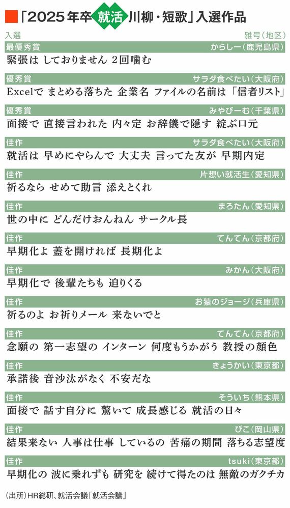 さて、HR総研のオフィシャルページでは、「2025年卒 就活川柳・短歌」の全入選作品について、作者の思いを踏まえての寸評・解説とともに掲載している。それぞれの作者がどんな気持ちでこの川柳や短歌を詠んだのか、ぜひご覧いただきたい。
