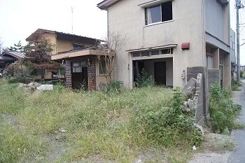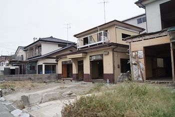 ■津波被害を受けて住む人がいなくなった住宅(石巻市大門町)