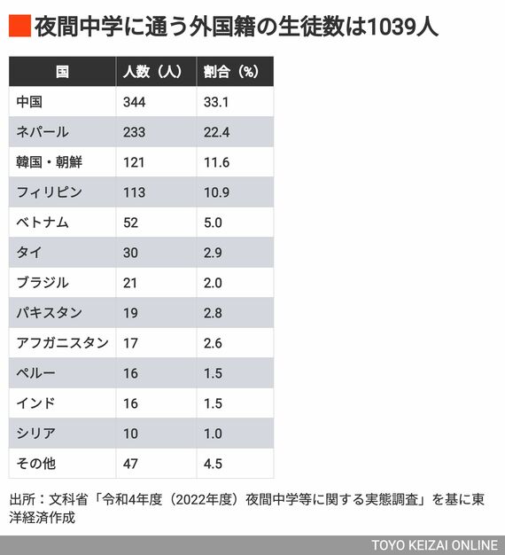 文部科学省の「令和4年度(2022年度)夜間中学等に関する実態調査」によると、夜間中学に通う全生徒数は1558人、そのうち日本国籍を有しない生徒数は1039人。外国籍の生徒が66.6%を占めている。国・地域別の上位は中国344人(33.1%)、ネパール233人(22.4%)、韓国・朝鮮121人(11.6%)、フィリピン113人(10.9%)、ベトナム52人(5.0%)で、パキスタンやアフガニスタン、シリアなどイスラム教国の生徒も珍しくない。