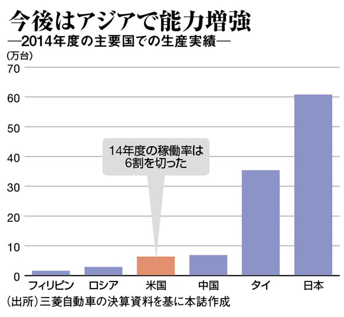 現在、三菱自動車の世界生産台数は127万台で、日本とタイが全体の7割超を占める(上図)。日本は欧米向けの輸出拠点として、またタイは新興国向けの輸出車両を中心に生産している。