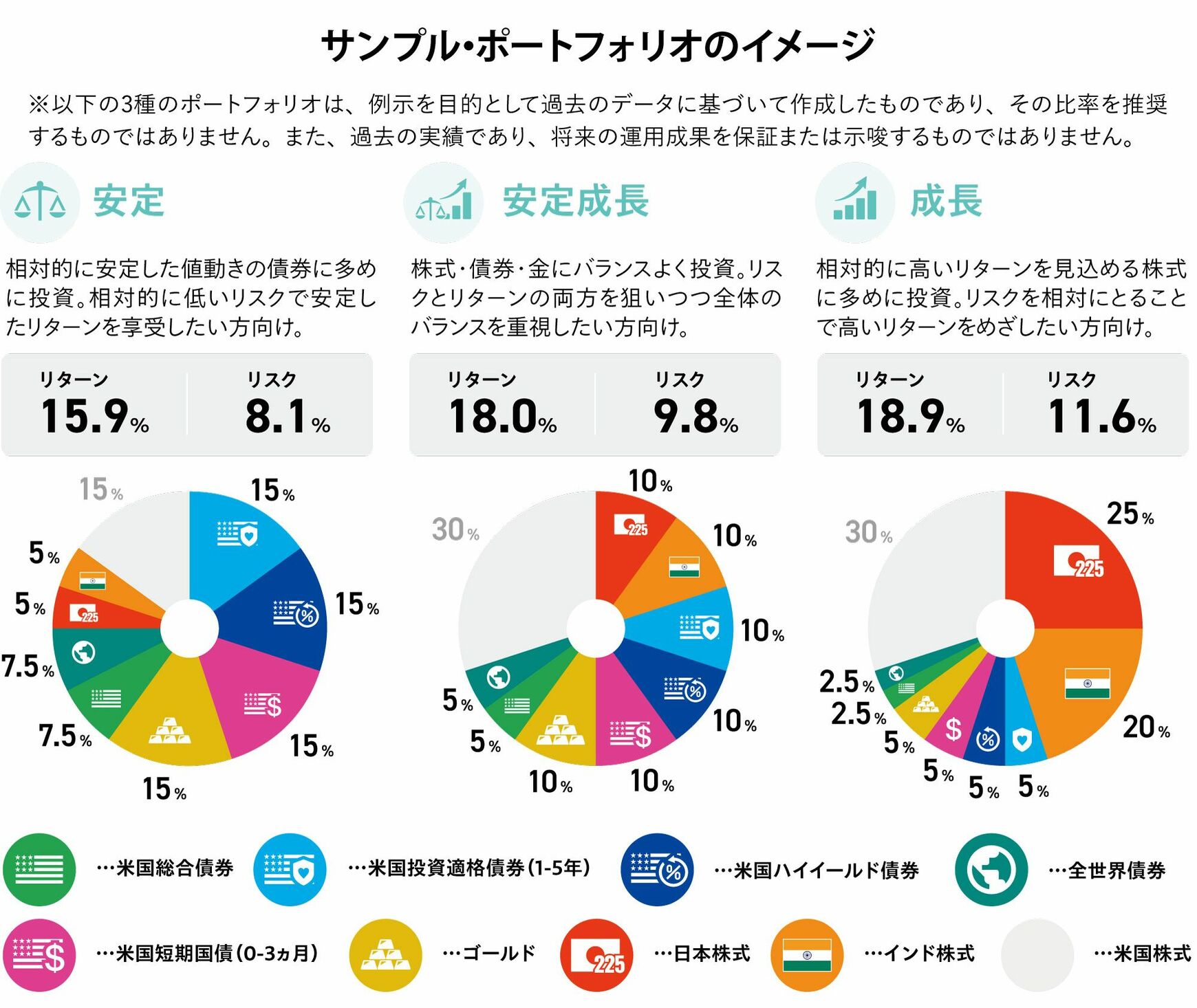 米国総合債券=「ブルームバーグ米国総合債券インデックス」、米国投資適格債券(1‐5年)=「ICE・BofA・1-5年米国社債インデックス」、⽶国ハイイールド債券=「ICE・BofA・USハイイールド・コンストレインド・インデックス」、全世界債券=「ブルームバーグ・グローバル総合 インデックス(米ドルヘッジ)」、米国短期国債(0‐3ヵ月)=「ICE 0-3ヵ⽉ 米国国債インデックス」、ゴールド=「LBMA ⾦価格指数」、日本株式=「日経225指数」、インド株式=「S&P BSE SENSEXインデックス」、⽶国株式=「S&P500指数」。海外資産は、各指数のトータルリターンを円換算して使⽤。