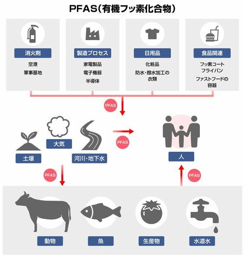 一方で、一部のPFASはその安定性から自然界で分解されにくく、「永遠の化学物質(フォーエバーケミカル)」とも呼ばれている。水源への流出や土壌への浸透を通じて、環境中や生物の体内に蓄積されるため、生態系や健康への影響が懸念されている。人体への有害性を指摘する研究も出てきており、「PFOS」「PFOA」「PFHxS」といった一部の種類のPFASについては、国際的に規制対象となっている。