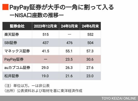 すでに実績が出ているのが、今年から新制度に移行したNISAだ。PayPay証券の6月末のNISA口座数は30万を超え、松井証券とauカブコム証券を抜いて4位に浮上した。