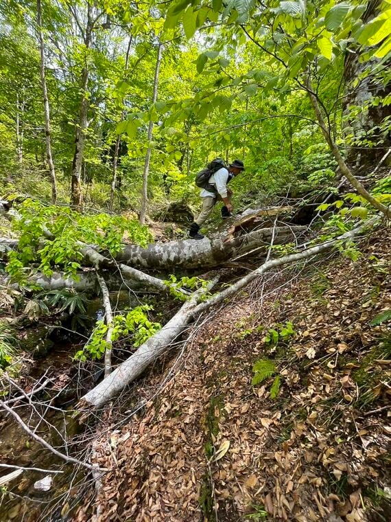 キクリンの案内で、山梨県のあるポイントへ行くと、そこにあった台場クヌギの巨木が幹の途中から倒れていた。洞内が朽ちて重みを支えきれなくなったのだろう。キクリンが過去にも採集した木だったので、とても残念そうだった。残った幹の周りを見たがもうオオクワの気配はなかった。