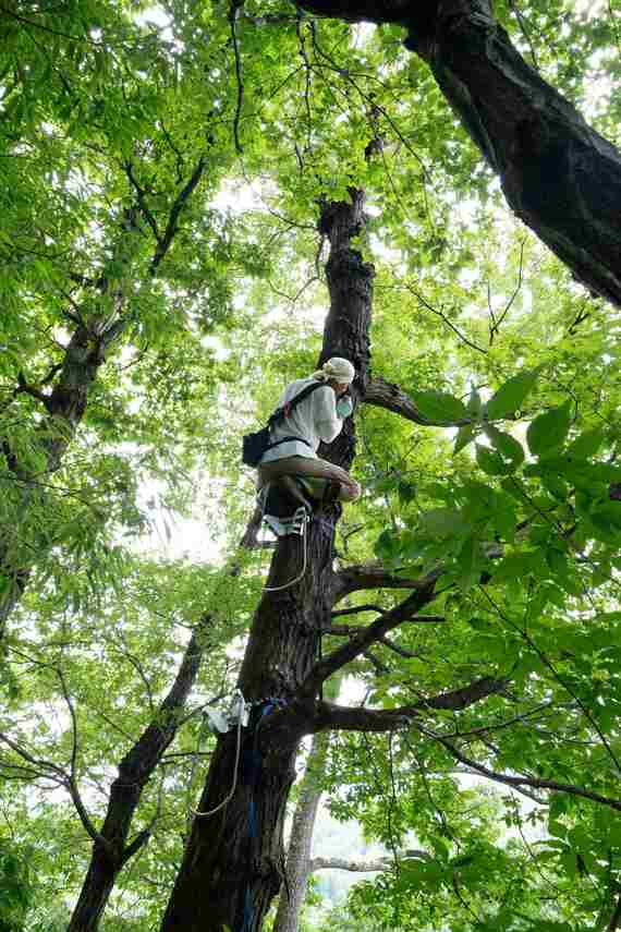 崖はほぼ垂直に40メートルほどの高さに切り立っており、コナラが生えているのはそのふちだ。キクリンははしごをかけると3メートルの高さまで登った。そこからさらに5メートル上に、直径4センチほどの穴が空いている。