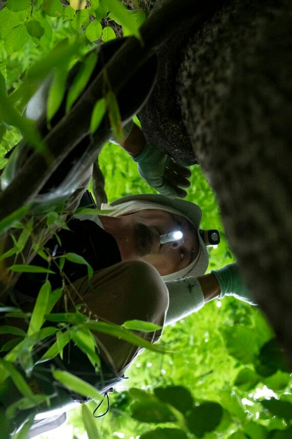 隙間に潜っている個体が見えるという。だがキクリンは左手で木につかまっているため、右手しか使うことができない。スティックを隙間に差し込み、それ以上奥に入り込まないようにするのが精一杯だ。
